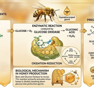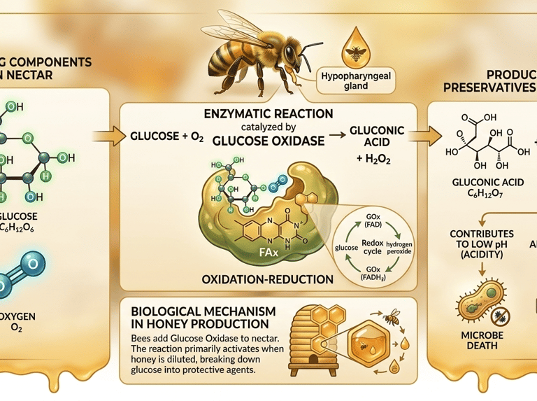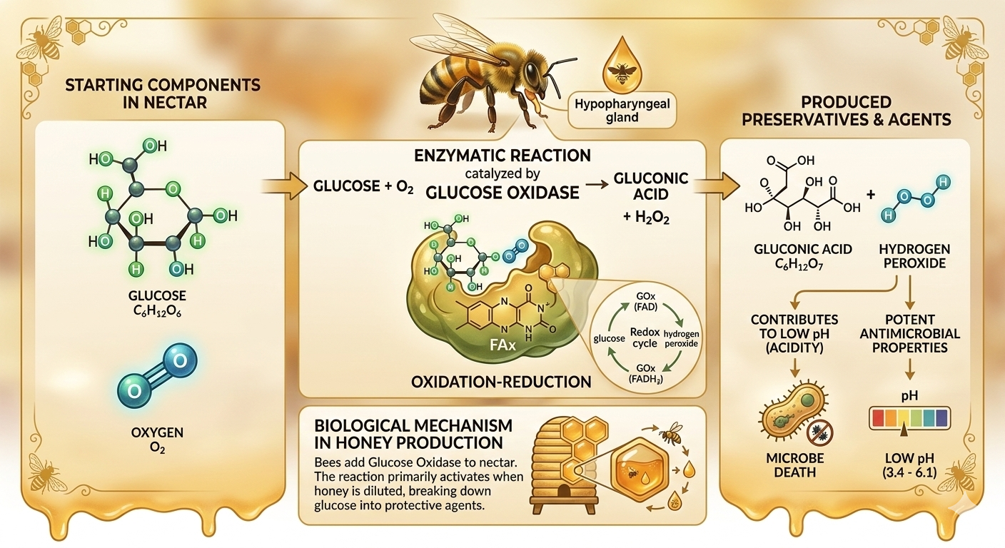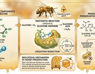 This enzyme acts as a biological "time-release" preservative. Once added to the nectar, glucose oxidase initiates a series of complex biochemical changes during the ripening process within the hive. In the presence of oxygen, the enzyme begins the slow oxidation of glucose. This doesn't just create a single chemical; it fundamentally alters the nectar's molecular profile, lowering its pH and preparing it for long-term storage.
